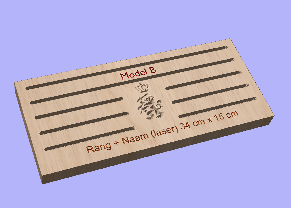 - Model A: 5 groeven 1 regel tekst onder (34cmx15cm)